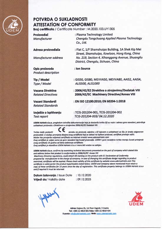Our company has passed the tight examination by UDEM Organization that our ion sources are conformable to 2006/42/EC Annex VIII Machinery Directive regulation. The CE Certificate is issued for our following ion source models: GIS50, GIS80, MEVVA50, MEVVA80, AAIS2, AAIS4, ALIS500, ALIS1000. =========================================================